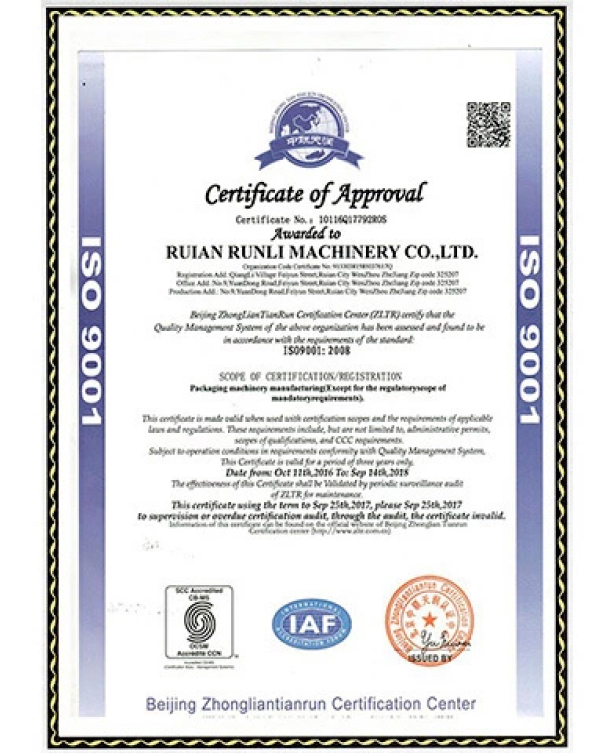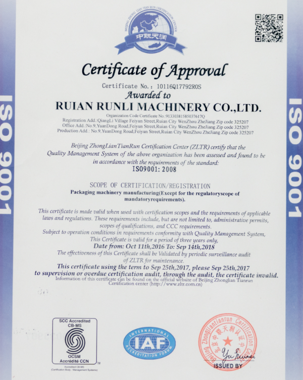 Runli achieved ISO9001:2015 Quality Management System certification and successfully launched fully automatic vacuum packaging machines.